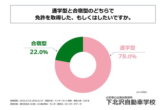 また、「通学型と合宿型のどちらで免許を取得した、もしくはしたいか」を尋ねる設問への回答では、「通学型」が78.0%、「合宿型」が22.0%という結果になりました。この結果から、都内在住の18歳~25歳の男女の約8割が、通学型で自動車免許を取得した、もしくはしたいことがわかりました。