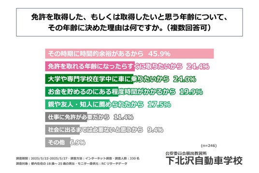 続いて、「免許を取得した、もしくは取得したいと思う年齢について、その年齢に決めた理由」を尋ねる設問への回答では、1位が「その時期に時間的余裕があるから」で45.9%、2位が「免許を取れる年齢になったらすぐに取りたいから」で24.4%、3位が「大学や専門学校在学中に車に乗りたいから」で24.0%という結果になりました。この結果から、免許を取得した、もしくは取得したいと思う年齢について、その年齢に決めた理由は、「その時期に時間的余裕があるから」が最も多いことが判明しました。