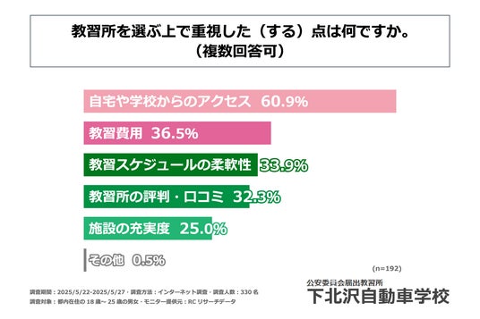 調査の最後、通学型で自動車免許を取得した、もしくは取得したいと回答された方を対象に「教習所を選ぶ上で重視した(する)点は何か」を尋ねる設問への回答では、1位が「自宅や学校からのアクセス」で60.9%、2位が「教習費用」で36.5%、3位が「教習スケジュールの柔軟性」で33.9%という結果になりました。この結果から、教習所を選ぶ上で最も重視した(する)点は、「自宅や学校からのアクセス」であることがわかりました。