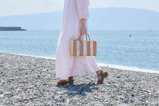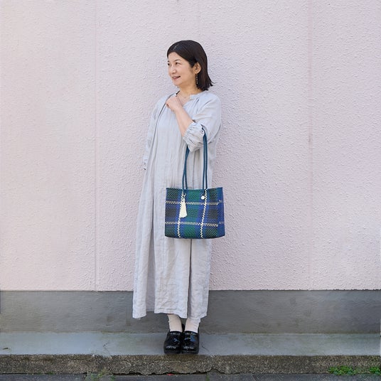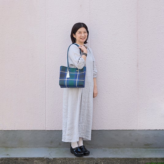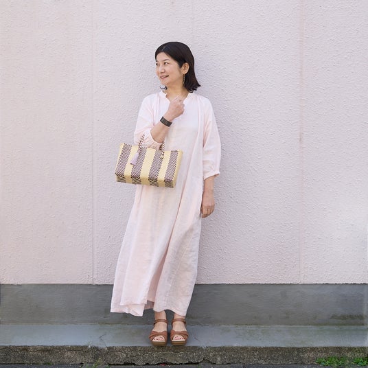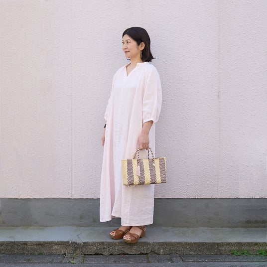 手に持っても、腕にかけても持ちやすい。ワンピースとのバランスが良い横長のメルカドバッグ。