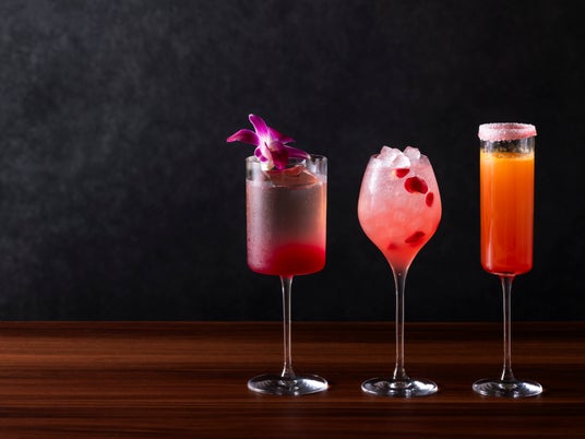 グラスに散らしたローズを花火に見立てパッションフルーツと炭酸の刺激ではじけるカクテル