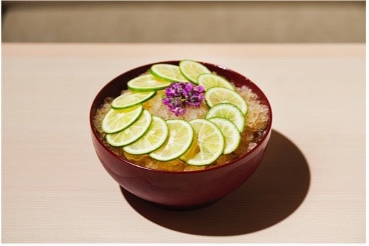 徳島県の半田素麺とすだちを使った素麺。小麦の風味と喉越しが特徴の素麺と、すだちのすっきりとした香りが相性抜群です。鰹節、昆布、椎茸の合わせ出汁をシャーベット状にすることで、最後まで風味を損なわずに楽しめます。