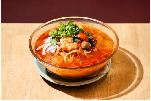つるつると喉越しのよいタイの米麺と、ハーブがたっぷり入った辛味とコクが絶妙な冷たいトムヤムスープの組み合わせ。キンキンに冷えた器で提供される、暑い夏に味わいたい一品です。