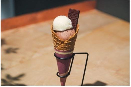 希少なカカオの果肉を使った爽やかなソルベと、濃厚なチョコレートアイスの2つのフレーバーを堪能できるコーンアイス。チョコレートの満足感と、軽やかな後味が特徴です。Minimal自慢の板チョコレートも一緒にどうぞ。