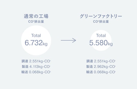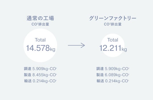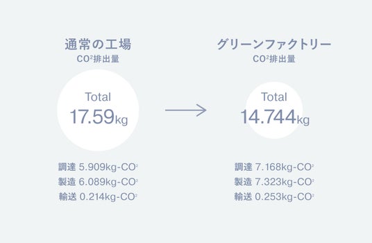 第3弾となる今回のemmi x PlaX(TM)の製品に関するLCA分析では、製造過程で排出されるCO2の量に着目した比較を実施。通常の工場で製造したものと、必要電力の45%をソーラー自家発電でまかなっている"グリーンファクトリー"で製造したものでは、CO2排出量を1製品あたり15~17%削減できることが明らかになりました。