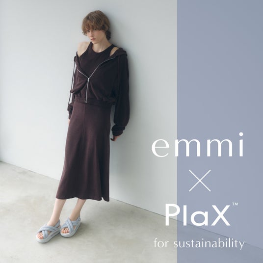 サステナブル素材を積極的に採用するemmiは、CO2の排出量の削減による環境負荷の軽減に貢献するPlaX(TM)を採用。昨年ssシーズンより始まったコラボレーションの第3弾となります。