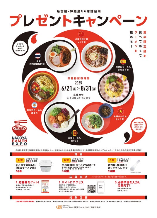 名古屋・驛麺通りの対象6店舗にて、限定麺をご注文いただいた方に、1杯ごとに「応募券」を1枚進呈いたします。