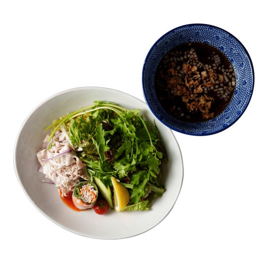 エスニック料理には欠かせない魚醤を効かせたつけ汁に、生春巻きやパクチーなどベトナムを代表する食材を彩り豊かに盛り付けました。