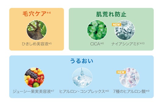 *⁹保湿成分: ジメチルシラノールヒアルロネート、加水分解ヒアルロン酸Na、ヒアルロン酸K、ヒアルロン酸、ヒアルロン酸ヒドロキシプロピルトリモニウム、ヒアルロン酸クロスポリマーNa、ヒアルロン酸ジメチルシラノールNa