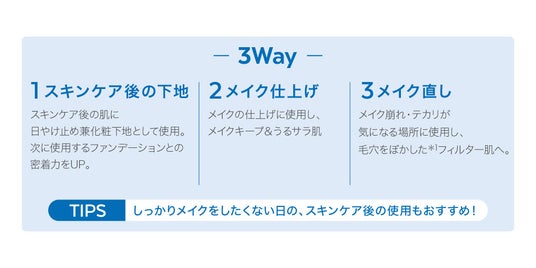 夕方のメイク直しも上から乗せるだけでテカリ抑えと日やけ止めの塗りなおしを実現し、