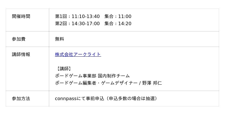 また、第一弾講演情報やブース情報を公開しました。会場内で行われるボードゲーム制作ワークショップの抽選申込も開始しました。