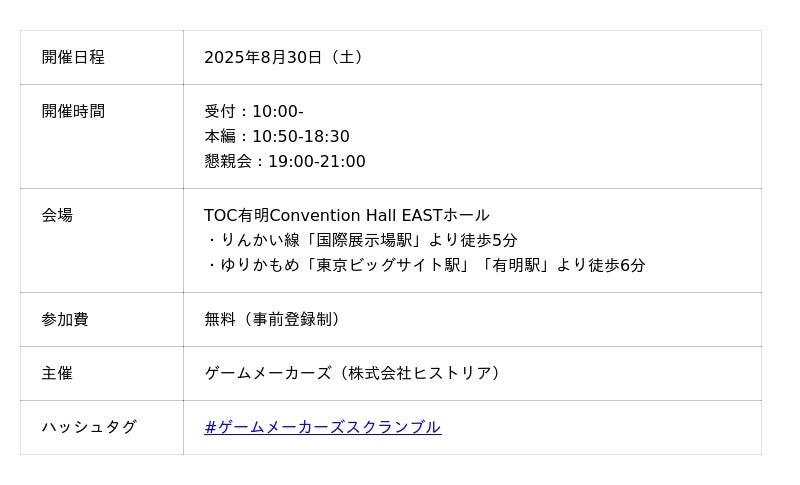 ゲーム制作系Webメディア「ゲームメーカーズ」(運営:株式会社ヒストリア)は、2025年8月30日(土)に東京・TOC有明Convention Hallにて開催する「ゲームメーカーズ スクランブル2025」の参加登録を開始しました。