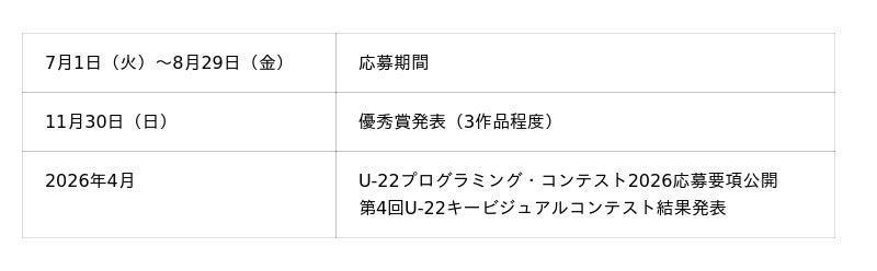 U-22プログラミング・コンテスト2025および第4回U-22キービジュアルコンテストは、7月1日応募受付を開始しました。(締切:8月29日)。U-22プログラミング・コンテストは若手プログラマー・クリエイターを対象としたコンテストで、46回目の開催を迎えます。