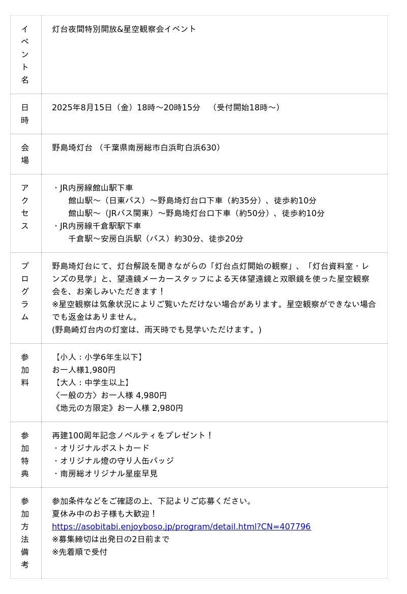 \千葉県 野島埼灯台 再建100周年記念/【参加者募集】灯台夜間特別開放&星空観察会イベント開催!