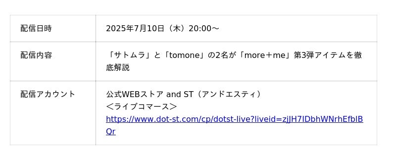 第3弾先行予約販売に合わせて、7月10日(木)20:00よりライブコマース配信を予定しています。「サトムラ」と「tomone」の2名が出演し、本人がアイテムのこだわりポイントを徹底解説いたします。