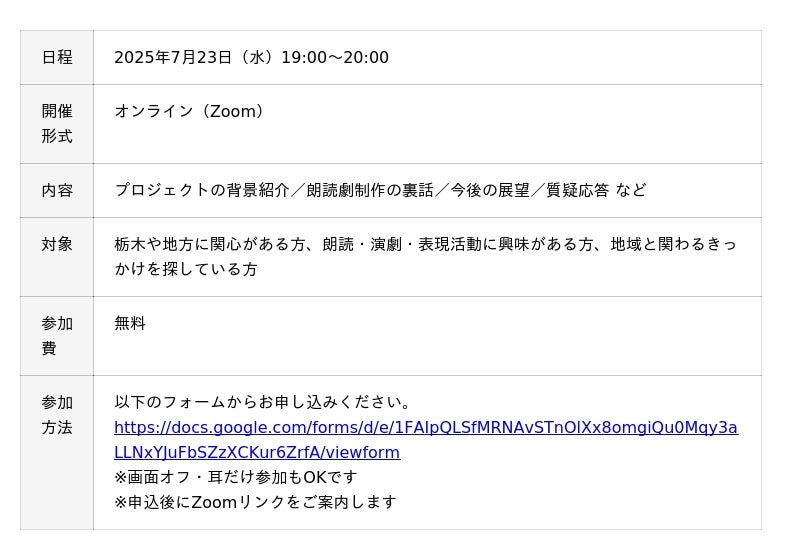 また、より多くの方に本取り組みを知っていただくため、2025年7月23日(水)には「オンライン座談会」を開催。朗読劇制作の裏話や今後の展望を共有し、地方や表現活動に関心のある方との接点づくりを図ります。