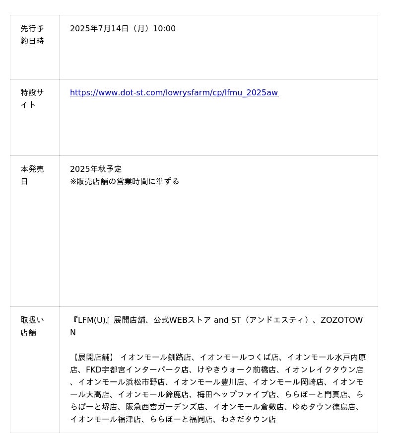 LOWRYS FARMは、新たにジェンダーミックスなユニセックスライン『LFM(U)』を始動。タイムリーベーシック、オトナストリート、ユーモア、シェアワードローブの4つの要素をコンセプトに、メンズのテクニックやこだわりとレディースブランドの強みである色使いやトレンド感覚を掛け合わせ、ボーダレスなフィルターを通すことで生まれる洗練された新しいユニセックスライン。性別を問わずに着用いただける商品を展開いたします。公式WEBストアand STでは、先行予約を開始し、一部ラインアップを公開中です。本発売は2025年秋を予定しています。