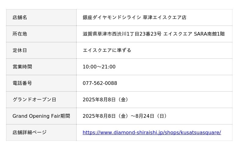銀座ダイヤモンドシライシが滋賀県に初出店。2025年8月8日(金)「草津エイスクエア店」グランドオープン/オープニングフェアを開催