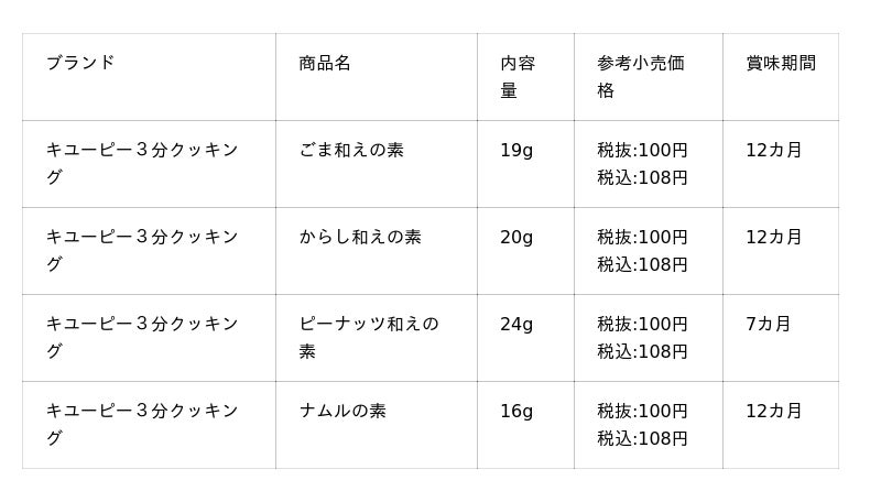 キユーピー株式会社(本社:東京都渋谷区、代表取締役 社長執行役員:高宮 満、以下キユーピー)は、「キユーピー3分クッキング」ブランドの「ごま和えの素」の味わいをリニューアルし、8月21日(木)より全国に出荷します。併せて「和えの素」シリーズ全品のパッケージを、「キユーピー3分クッキング」ブランドとひと目でわかる、料理のコツやひと手間を「壺」に詰め込んだイメージのデザインに変更します。今後「キユーピー3分クッキング」ブランドは、スーパーマーケットなどの売場を横断して商品を展開していきます。