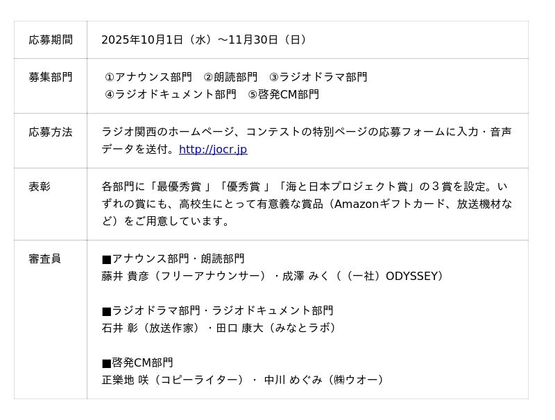 最終選考に残った優秀作品は、2026年1月11日(日)12:00~15:00に放送されるラジオ関西(AM558/FM91.1)の特別番組内で紹介・放送し、最終審査の結果を発表します。