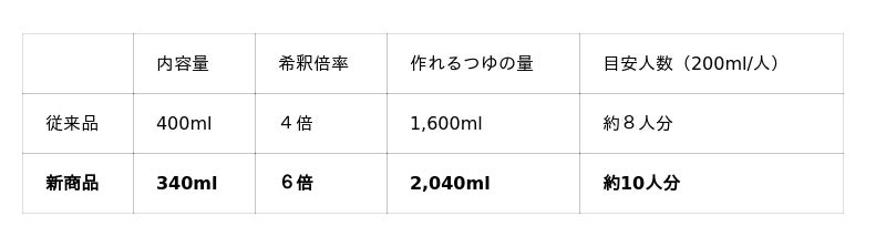 従来品の4倍濃縮から6倍濃縮へと変更し、1本で使える量が約8人分から約10人分へと増加。経済的でありながら、必要な量だけ使える仕様が少人数家庭や個食にもぴったりです。