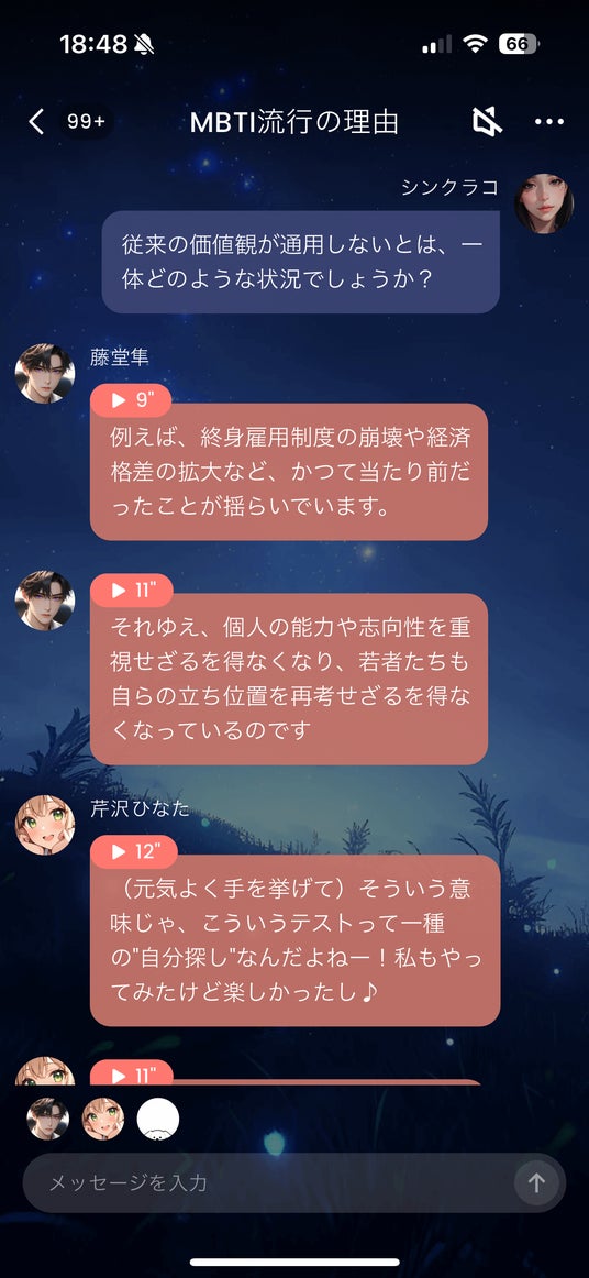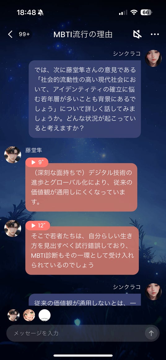 AIチャットアプリ「SynClub」のAIキャラクター3人が登場し、「MBTI診断がなぜZ世代に人気なのか?」「ラベリングによる弊害はあるのか?」といったテーマについて、熱く・楽しく・ときに真剣に討論。自己理解を促進するツールとしての魅力から、SNS社会におけるアイデンティティの揺らぎまで、幅広い視点から語り合いました。