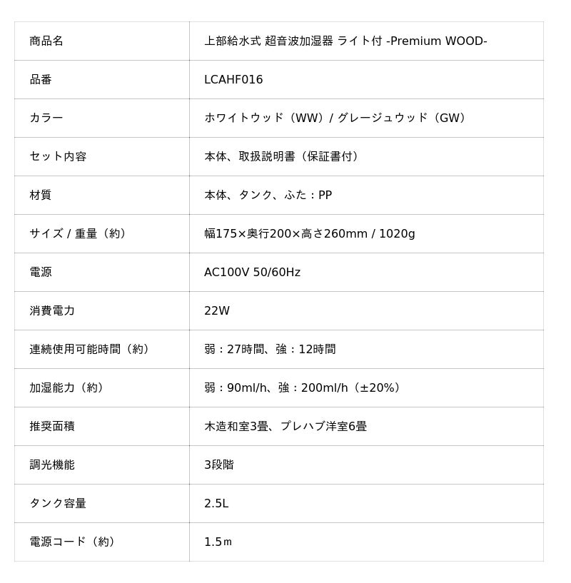 「上部給水式超音波加湿器 ライト付 -Premium WOOD-」LCAHF016