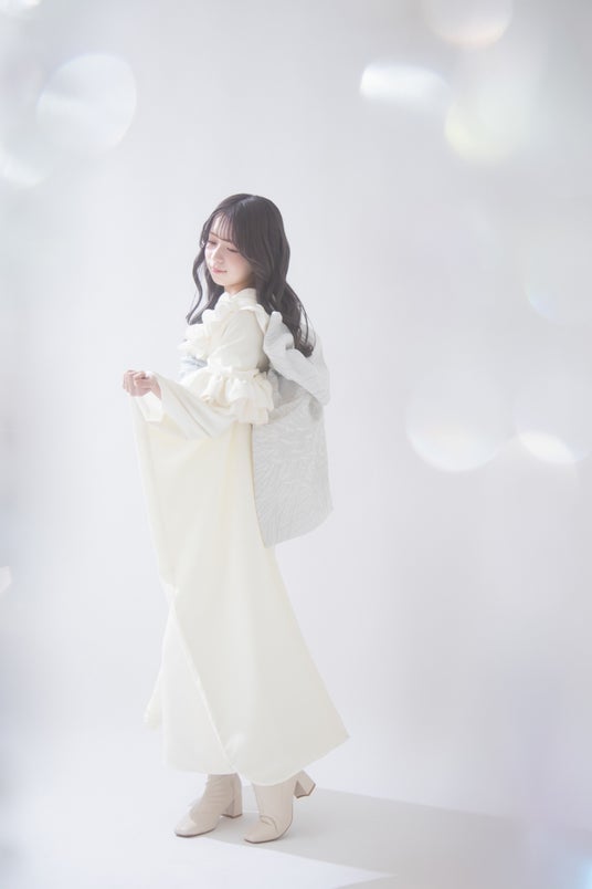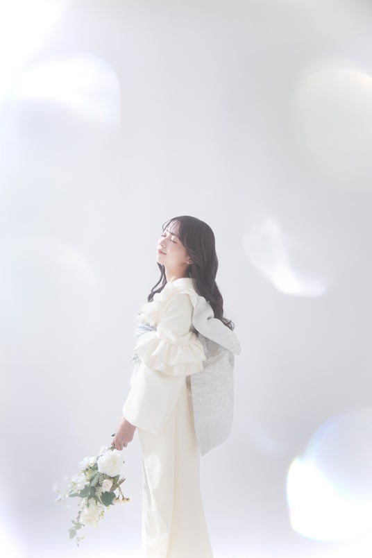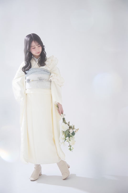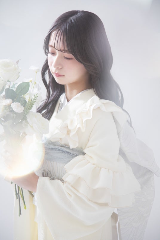 真っ白でデザイン性のあるフリルがあしらわれた新作振袖。その特徴を活かし、柔らかな光に包まれた幻想的な世界観の中で儚さの一瞬を捉えた、印象に残る"忘れがたい"美しさを演出しました。