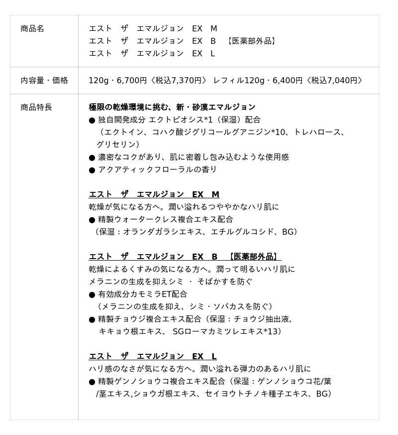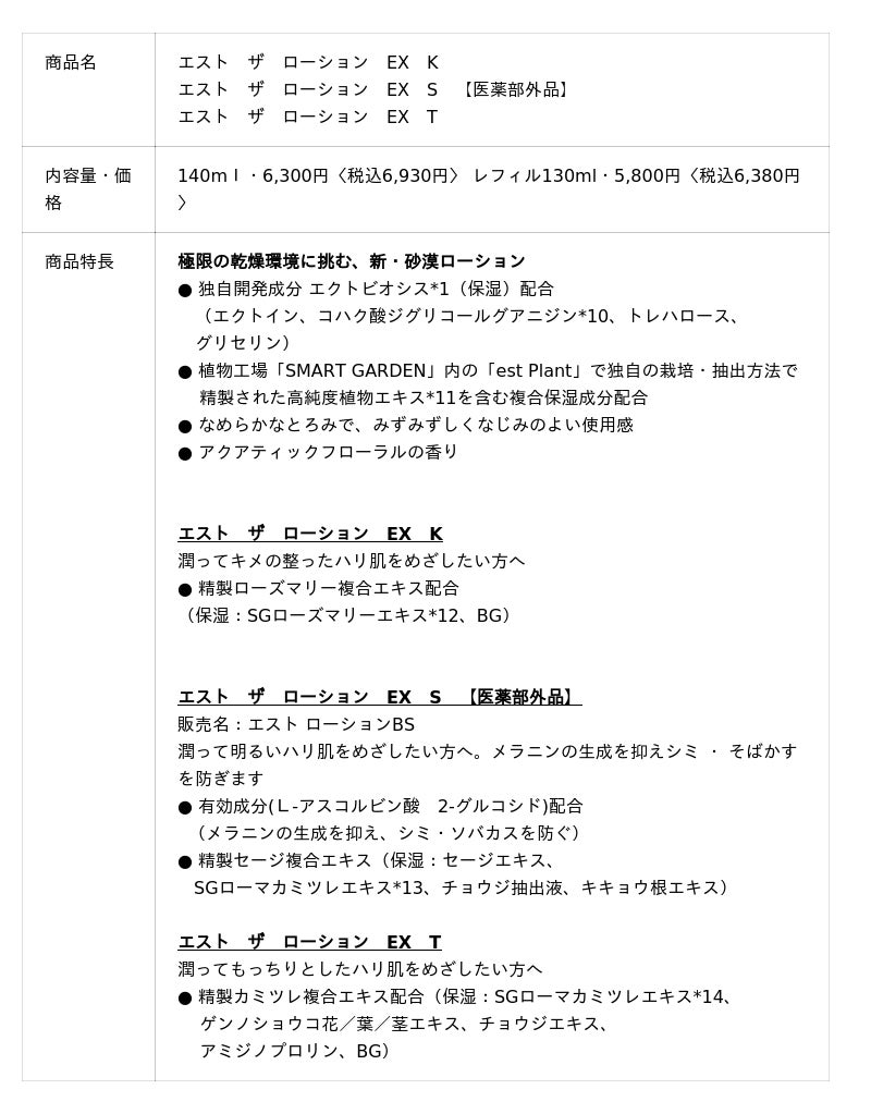 『エスト ザ ローション EX』 『エスト ザ エマルジョン EX』は、極限の乾燥環境でも潤いを保つ力を備えた新・砂漠スキンケアです。極限の乾燥環境下でも細胞が壊れることなく維持され、干からびても死なずに生き続ける「ネムリユスリカ」(幼虫)の生態に着想。砂漠のような過酷な乾燥環境下でも水を留めて潤いとハリに満ち続ける肌をめざして、新たなスキンケアアプローチを開発しました。「est」独自開発成分「エクトビオシス*1 (保湿)」により、角層内部の水分を「貯める*3」「結ぶ*4」「強化する*5」という水を操る3つのステップで、砂漠のような乾燥下でもうるおいが持続。潤いに満ち溢れ、むっちりとしたハリのある肌に導きます。肌悩みの原因*6に合わせて選べる化粧水『エスト ザ ローション EX』 3種(うち医薬部外品1種)、肌状態に合わせて選べる乳液『エスト ザ エマルジョン EX』3種(うち医薬部外品1種)をラインアップし、お肌に合ったエイジングケア*7を叶えます。