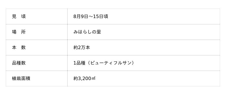 国営ひたち海浜公園の「みはらしの里」では、約2万本のヒマワリがもうまもなく見頃を迎えようとしております。8月1日頃から咲き始めたヒマワリは、9日頃に見頃を迎え15日頃までは比較的花数が多い状態で楽しめると予想しています。夏の代表的な花として人気が高く、真夏の太陽に向かって大きな花を咲かせる花姿が魅力のヒマワリ。花畑一面を覆い尽くす色鮮やかな黄色い花が、昔懐かしい古民家や広大なコキアの丘を背景に、夏空を彩る風景をお楽しみいただけます。
