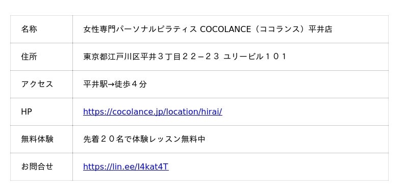 【平井駅 徒歩4分】女性専門パーソナルピラティス COCOLANCE(ココランス)平井店が2025年9月1日にオープン
