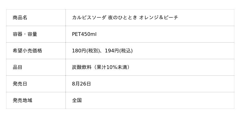 『カルピスソーダ 夜のひととき オレンジ&ピーチ』8月26日発売