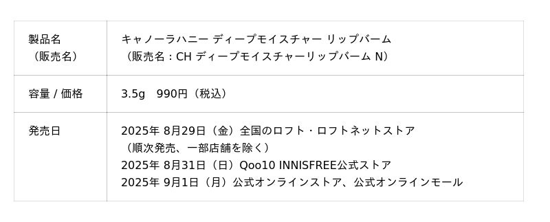 チェジュ島に咲く菜の花から採れるハチミツエキス*⁸とホホバ種子油、ツバキ種子油、マンゴー種子脂、アーモンド油の4種の植物由来の保湿成分が、唇に潤いを与えて荒れやかさつきから守り、しっとりなめらかなした唇へと整えます。
