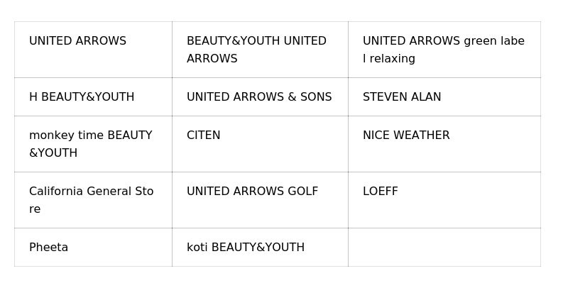 1989年創業。独自のセンスで国内外から調達したデザイナーズブランドとオリジナル企画の紳士服・婦人服および雑貨等の商品をミックスし販売するセレクトショップを運営しています。「ユナイテッドアローズ」「ビューティー&ユース ユナイテッドアローズ」「ユナイテッドアローズ グリーンレーベル リラクシング」などのブランドやレーベルを展開。