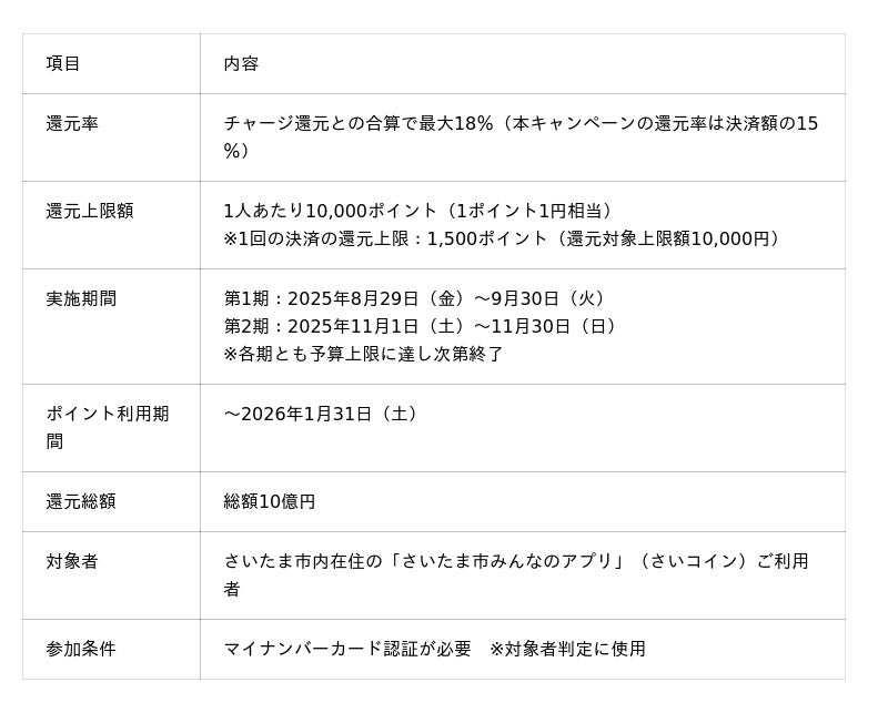 2.家計に”ほっ♪”日々のくらし応援キャンペーン (8月29日開始)さいたま市内在住の方を対象に、「さいたま市みんなのアプリ」の「さいコイン」でのお買い物時に決済額の15%分の「たまポン」を還元いたします。