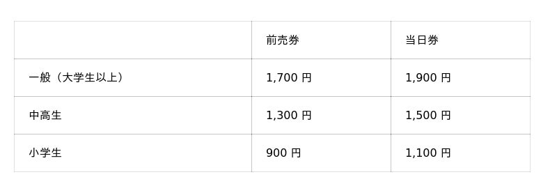 ※前売券はオンライン(Boo-Woo チケット、ローソンチケット)またはコンビニ店頭(ローソン、ミニストップ)で、当日券は会場で販売。前売券の販売は入場指定日の前日 22:00 まで。