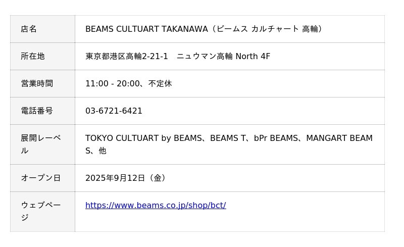 株式会社ビームス(本社:東京都渋谷区、代表取締役社長:設楽洋)は、東京港区の「高輪ゲートウェイシティ(TAKANAWA GATEWAY CITY)」に開業する大型商業施設「ニュウマン高輪(NEWoMan TAKANAWA)」に、アートやカルチャーの面白さを発信するプロジェクト「ビームス カルチャート(BEAMS CULTUART)」初の単独店として「ビームス カルチャート 高輪(BEAMS CULTUART TAKANAWA)」を、2025年9月12日(金)にオープンします。