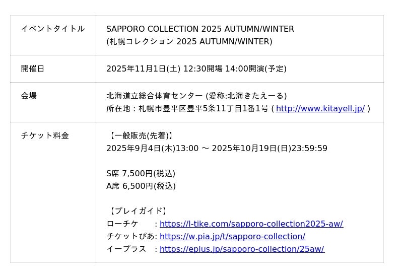 2025年11月1日(土)に札幌市豊平区の北海きたえーる(北海道立総合体育センター)で開催される北海道最大級のファッションイベント『SAPPORO COLLECTION 2025 AUTUMN/WINTER』(略称:『サツコレ2025AW』)は、チケットの一般販売を2025年9月4日(木)より先着制で開始いたしました。SS席は好評につき完売のため、現在はS席とA席のみお買い求めいただけます。