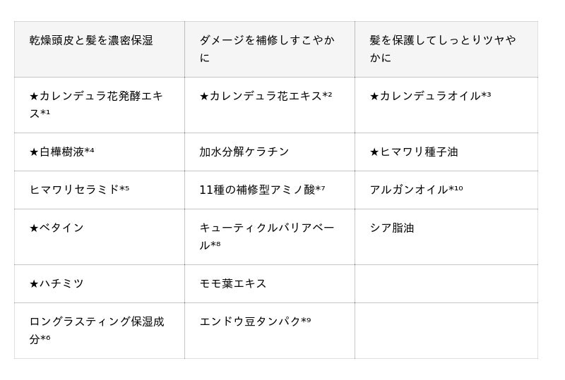 乾燥した頭皮と髪を濃密保湿・・・ カレンデュラ花発酵エキス*¹