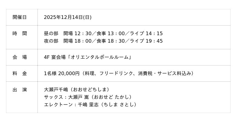 クリスマスショーでは、大瀬戸千嶋の洗練された音楽と軽妙なトークに加え、ホテル総料理長 岡竹正和の特別フレンチコースをご堪能いただけます。音楽と美食が響き合う、華やかで心に残るクリスマスのひとときをお楽しみください。