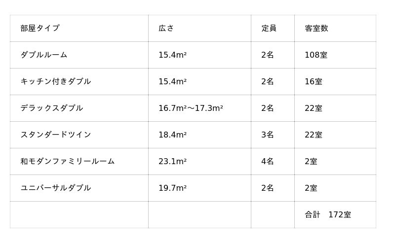 全客室の8割以上を占める「ダブルルーム」(約15.4平方メートル /ベッド幅150cm)は、快適な空間が広がります。温かみのある色調で統一した内装に、サータ社製の快眠ベッドや、大型テーブルとソファを備え、ご自宅のようにおくつろぎいただけます。全室に洗濯機・電子レンジ・2ドア冷蔵庫・加湿機能付き空気清浄機・50インチの大型スマートTVを完備し、長期の滞在にも便利な設備が整っています。