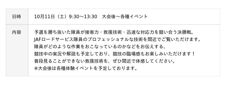 JAF(一般社団法人日本自動車連盟 会長 坂口正芳)は、2025年10月11日(土)ロードサービス隊員たちが日々の現場で培った接客力・救援技術・迅速な対応力などを競い合う「ロードサービス競技大会」の決勝大会を初めて一般公開いたします。