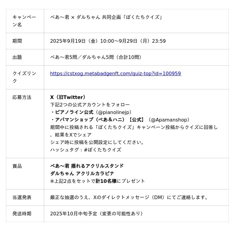 賃貸住宅仲介業店舗数No.1*¹のApaman Network株式会社(本社:東京都千代田区/代表取締役社長:山崎戒/APAMAN株式会社の連結子会社)は、ピアノ発表会の記念品・プレゼントを専門に扱う「ピアノライン」(運営:株式会社力匠/本社:東京都千代田区)は、両社の初コラボレーション施策として、アパマンショップ公式キャラクター「べあ~君」と、ピアノライン公式キャラクター「ダルちゃん」