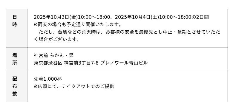 サラヤ株式会社(本社:大阪/代表取締役社長:更家悠介)は、2025年10月3日(金)、4日(土)の2日間、ラカントのコンセプトショップ「神宮前 らかん・果」(東京都渋谷区)にて「らかんか茶屋」をオープン。植物由来のやさしい甘さが特徴の“らかんか茶”を先着1,000名に配布することをお知らせします。