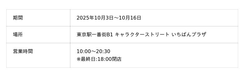 2025年10月3日(金)~10月16日(木) 東京駅一番街B1 東京キャラクターストリート いちばんプラザ