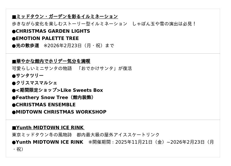 なお、三井不動産グループでは都内4施設(東京ミッドタウン、東京ミッドタウン日比谷、東京ミッドタウン八重洲、日本橋エリア)をはじめ、各所でイルミネーションを展開いたします。個性あふれる光の演出と共に、素敵なクリスマスシーズンをお過ごしください。