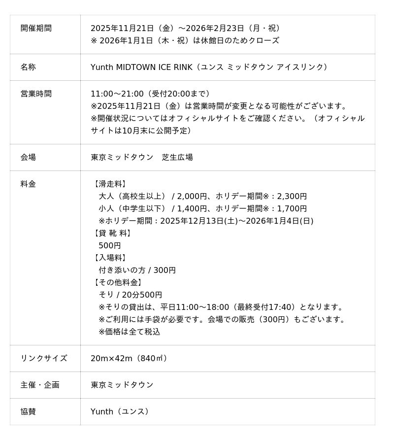 東京ミッドタウンの冬の風物詩、「MIDTOWN ICE RINK(ミッドタウン アイスリンク)」が今年もクリスマスシーズンから登場します。都内の屋外アイススケートリンクでは最大級かつ、本物の氷の上でスケートができる当イベントは今年で17回目。今年はスキンケアブランド Yunth(ユンス)とコラボレーションし、2月23日(月・祝)までの開催で、ウィンターシーズンを通してお楽しみいただけます。