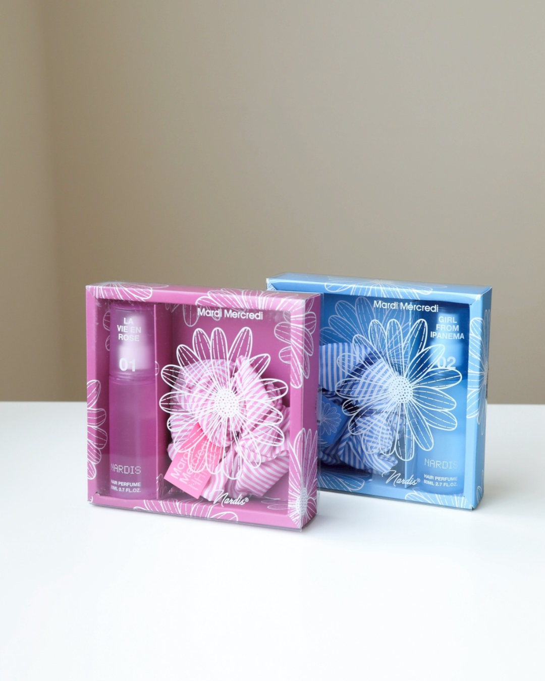 フラワーマルディがあしらわれたボックスに、オリジナルタグ付きのシュシュとヘアフレグランスがセットになった限定アイテム。
