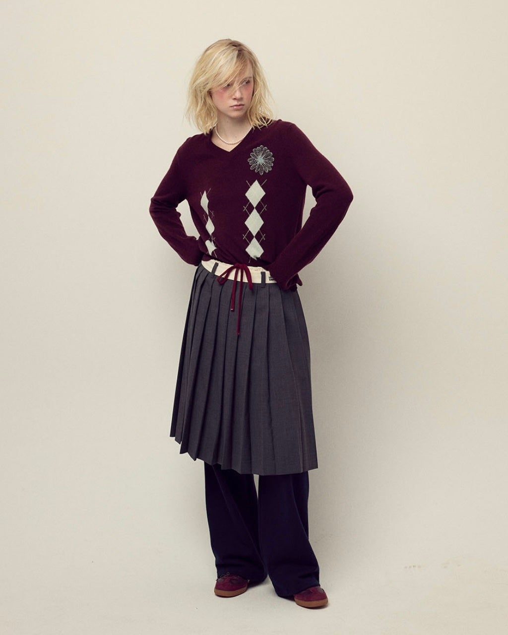 CASHMERE BLENDED V NECK ARGYLE / ¥18,700 WOOL PLEATED MIDI SKIRT CONTRAST WAISTBAND / ¥31,900