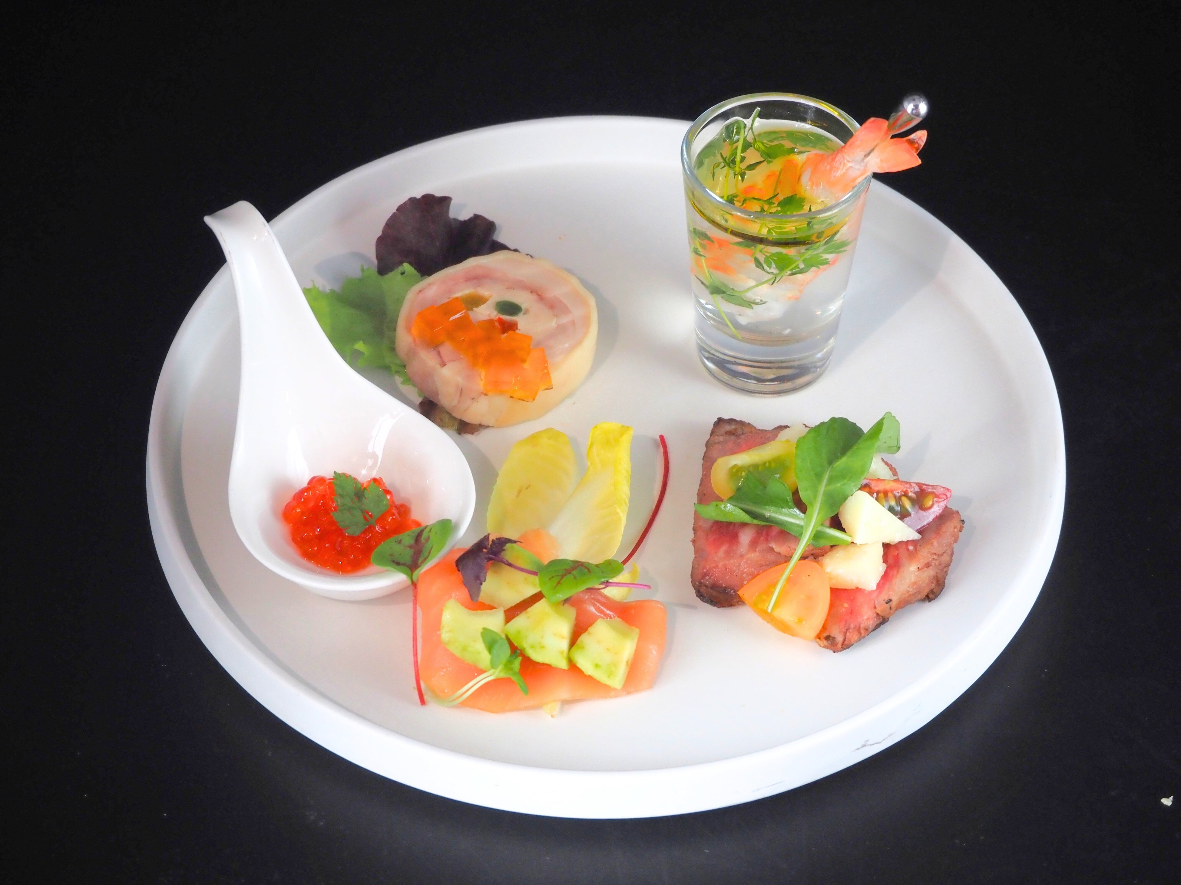 【前菜】前菜の盛り合わせ (あじわい鶏のガランティーヌ・スモークサーモンとイクラ・天使海老の塩水漬け・和牛たたきのタリアータ)